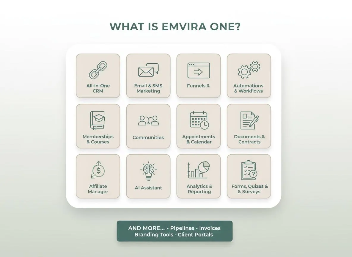 With EMVIRA ONE, you can bring everything your business needs into one place – CRM, funnels, email marketing, automations, community, and more.